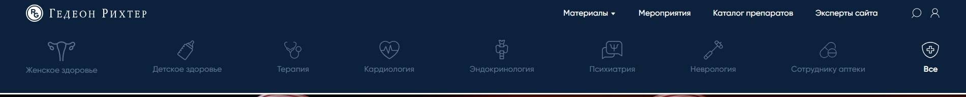 «Женской здоровье», «Детское здоровье», «Терапия», «Кардиология», «Эндокринология», «Психиатрия», «Неврология», «Сотруднику аптеки» и раздел «Все» – для пользователей, которые еще не авторизовались и не указали медицинскую специализацию.